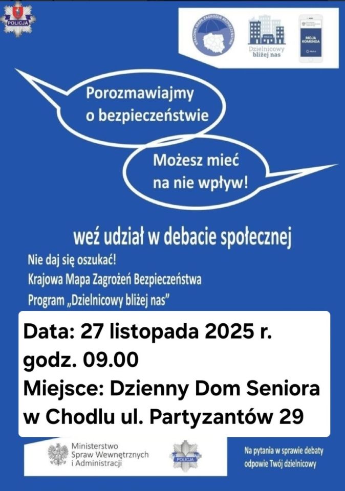Mieszkańcy gminy Chodel i gminy Łaziska są zaproszeni do udziału w debatach społecznych pod hasłem Bezpieczny Senior. Pierwsze spotkanie odbędzie się 27 listopada 2025 roku o godzinie 09:00 w Dziennym Domu Seniora w Chodlu przy ul. Partyzantów 29. Drugie spotkanie zaplanowano 28 listopada 2025 roku o godzinie 10:30 w sali konferencyjnej Urzędu Gminy w Łaziskach, Łaziska 76.