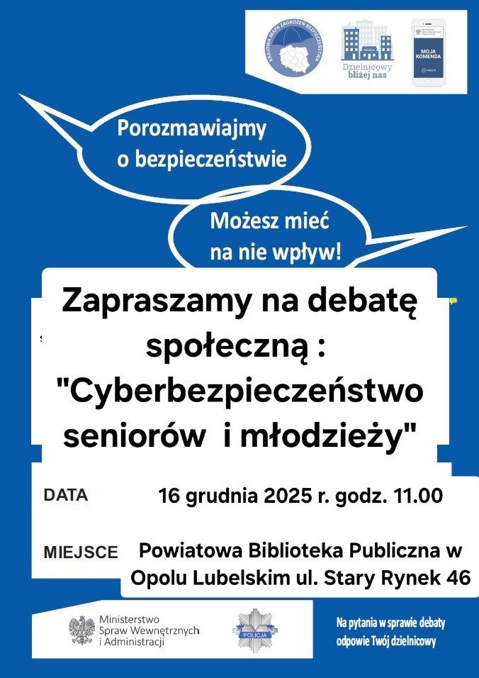 Zapraszamy mieszkańców gminy Opole Lubelskie na debatę społeczną poświęconą cyberbezpieczeństwu seniorów i młodzieży. Celem spotkania jest zdiagnozowanie oczekiwań społecznych w kwestii bezpieczeństwa w sieci oraz wymiana informacji pomiędzy społecznością a Policją w celu wypracowania praktycznych rozwiązań.
