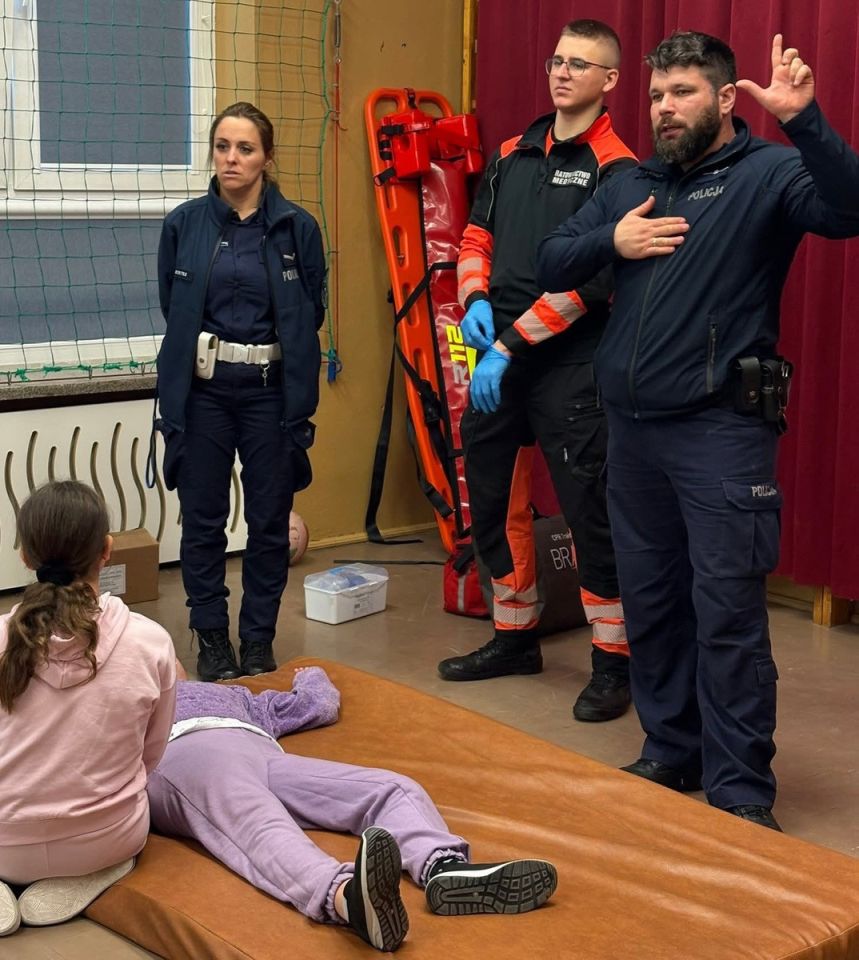 Ratownik medyczny wraz z policjantami przypomnieli uczniom konkretne zasady i zaprosili do praktycznych ćwiczeń. Dzieci mogły ćwiczyć resuscytację na fantomie, co pozwoliło im przećwiczyć nabyte umiejętności w warunkach zbliżonych do rzeczywistych.